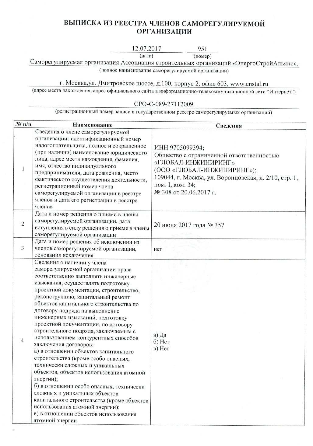 Выписка СРО Строительное